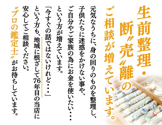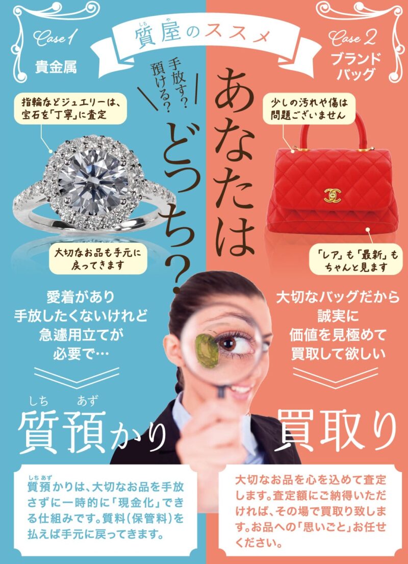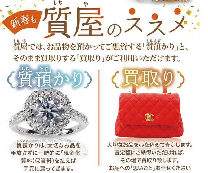 満足のいく『高額買取』出来る質屋として、店頭買取と宅配買取にも力を入れ迅速な対応を心掛けております。エルメス、ルイヴィトン、シャネル、グッチなどのブランド品・金・プラチナ・ダイヤ、ルビー、エメラルドなどの宝石ジュエリー、 ロレックス、カルティエなどの腕時計、金プラチナ製品、K18、K24、純金、Pt850、Pt900製品・着物・電化製品・金券チケット等を取り扱っており、高額査定と納得のいく説明にお客様から喜んで頂いています。