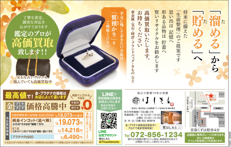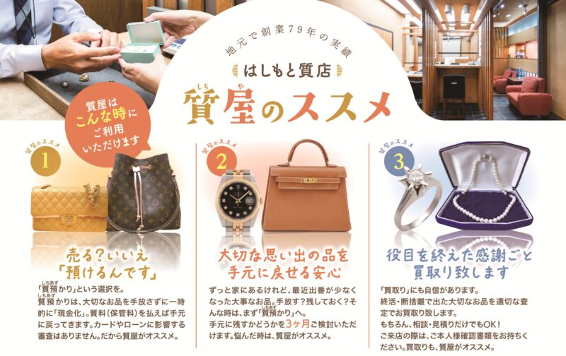 また、初めてのお客様に「きれいで入りやすい」「この質屋を選んで良かった」などの声を頂く事も多く、細心の気配りをしながら、 安心できる接客サービスの向上にも力を入れています。その甲斐あって、一度利用されたお客様の多くがまた来店してもらえるリピート率の高い質店となっております。女性のお客様が多く「紹介されて…」と来店されるお客様も沢山いらっしゃいます。是非、この大阪くずは駅前の橋本質店に一度お越し下さいませ。